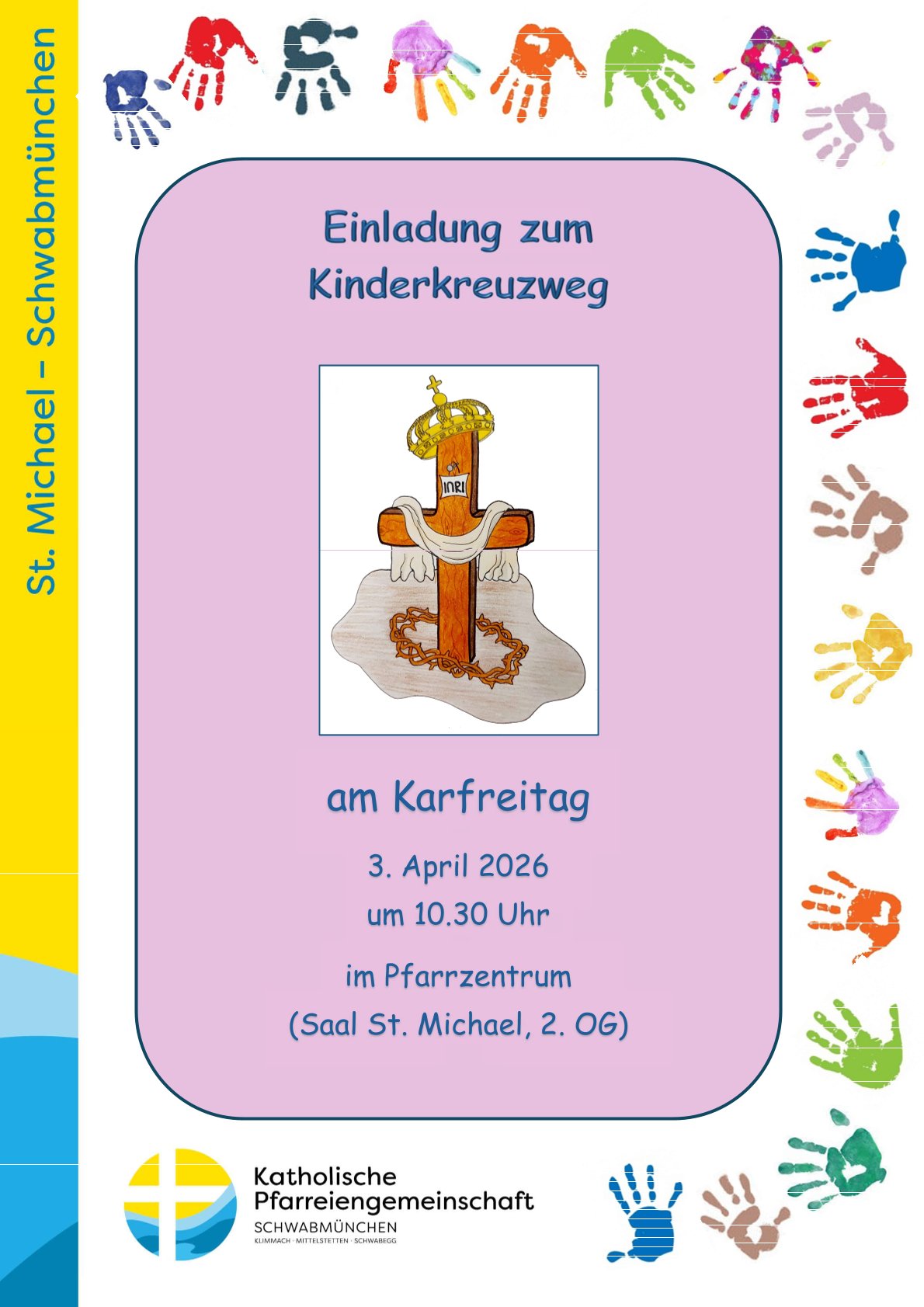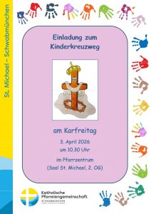 Karfreitag – 03. April 2026 – Kinderkreuzweg im Pfarrzentrum Schwabmünchen Posted on März 26, 2026 by Pfarreiengemeinschaft Schwabmünchen No comments Categories: Aktuelles, PGTags: auferstehung, Jesus, Karfreitag, Kinder, kreuzweg, Ostern Ostersonntag – 05. April 2026 – „Jesus lebt – mit ihm auch ich!“ Herzliche Einladung zur KleinkinderkircheKarfreitag – 03. April 2026 – Zwischen Scherben und Blumen
