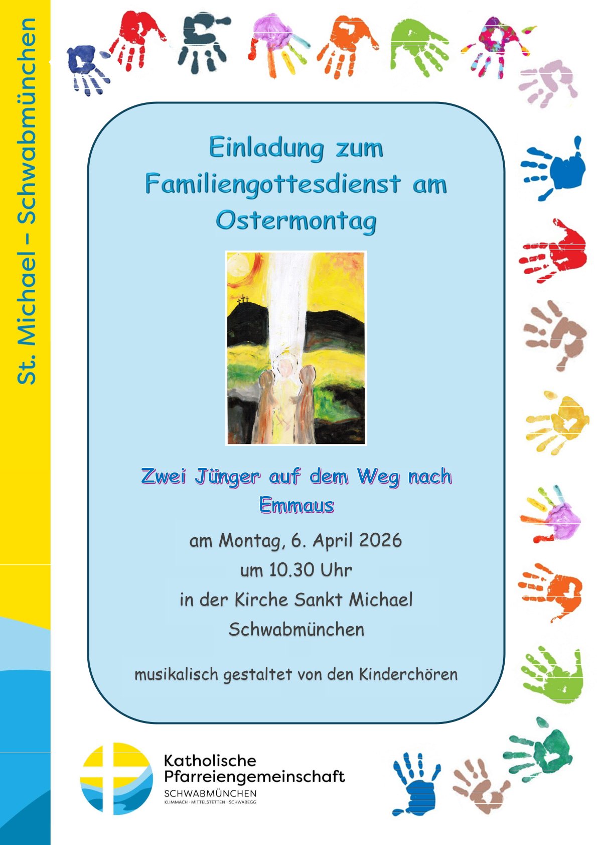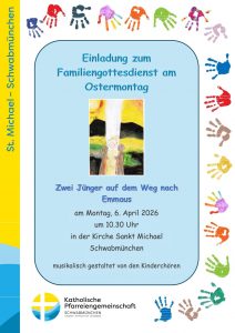 Ostermontag – 06. April 2026 – Familiengottesdienst in St. Michael Schwabmünchen Posted on März 25, 2026 by Pfarreiengemeinschaft Schwabmünchen No comments Categories: Aktuelles, PGTags: christ, emmaus, erziehung, Familie, Familienleben, Gottesdienst, jünger, Ostern, Schwabmünchen Gib mit ein Wort – Folge 71 – Sonntagsevangelium mal andersOstersonntag – 05. April 2026 – „Jesus lebt – mit ihm auch ich!“ Herzliche Einladung zur Kleinkinderkirche