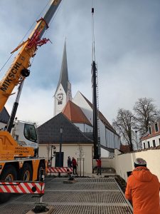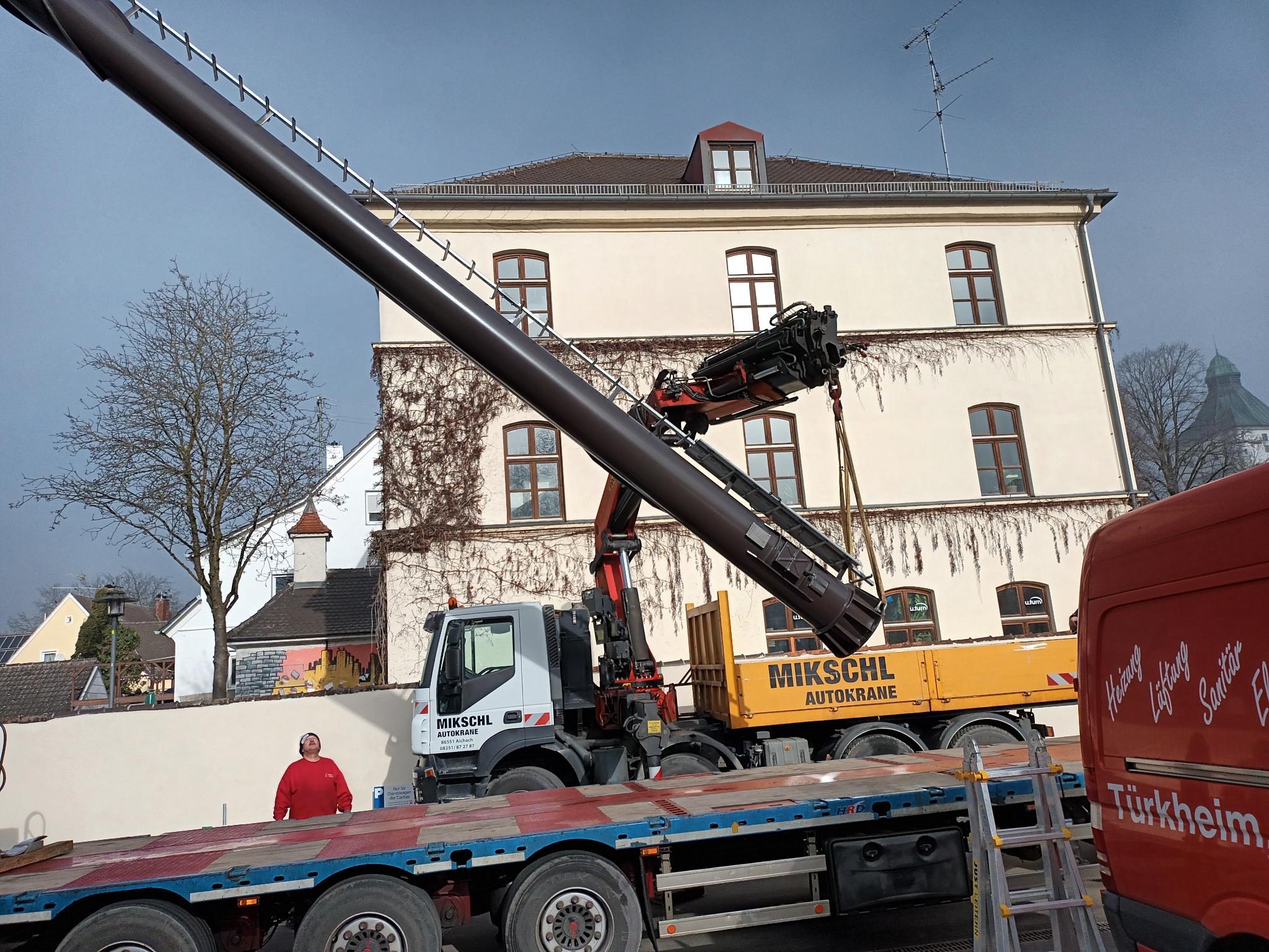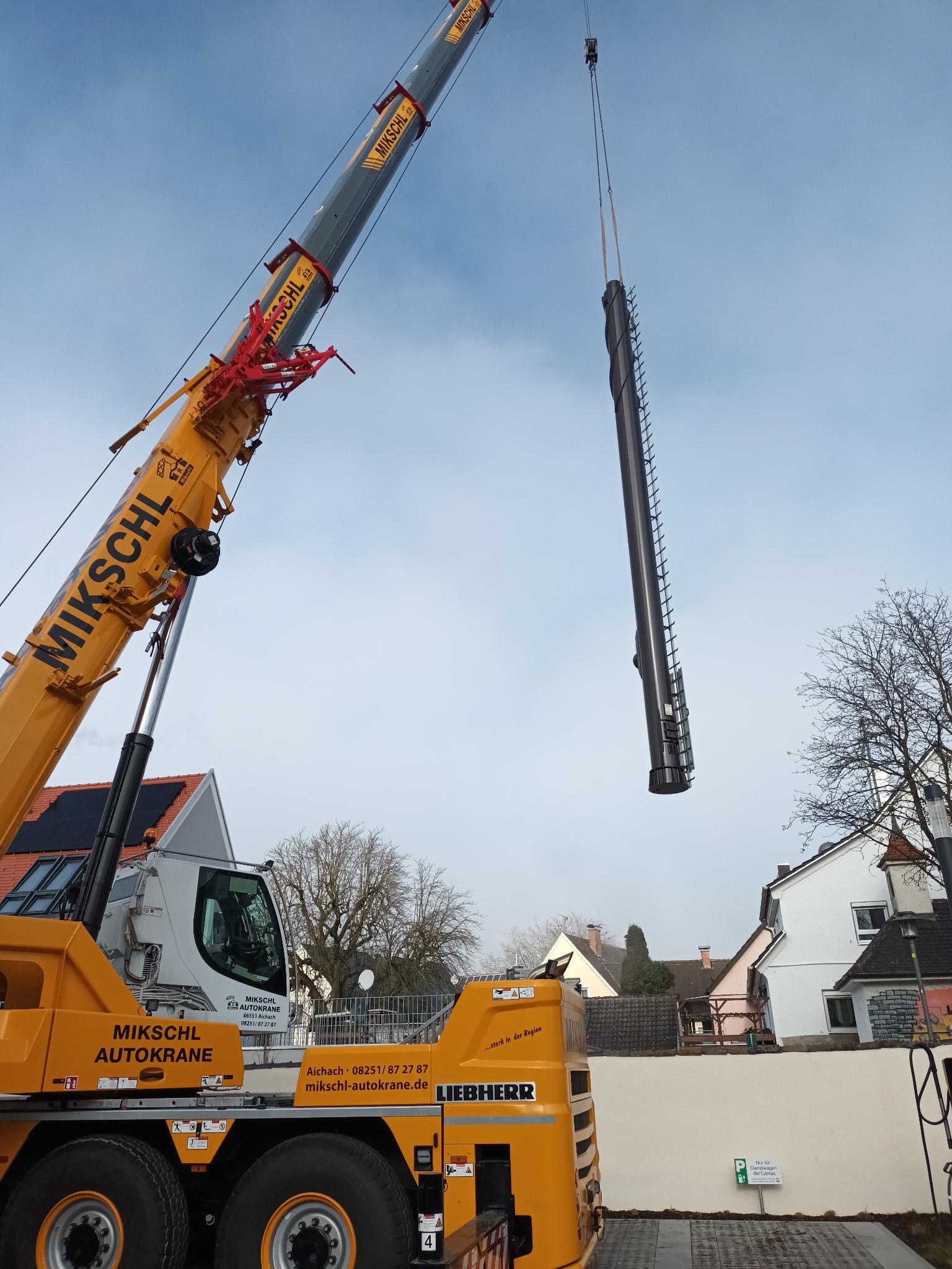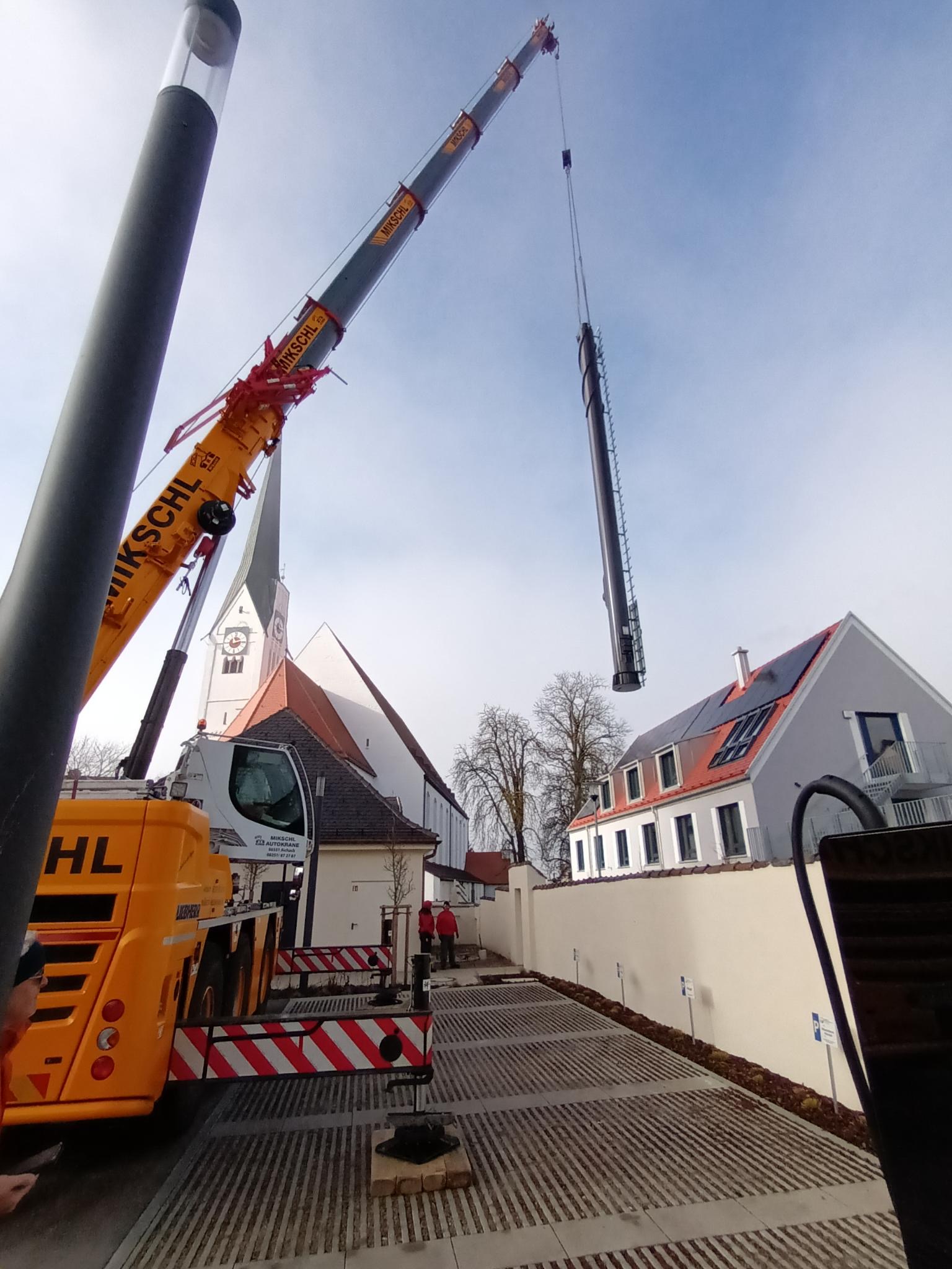 Am 5. Februar wurde am Pfarrhof die neue Schornsteinanlage für unser Nahwärmenetz geliefert und aufgestellt; der hohe Kamin wurde nötig, damit die Abgase der Heizanlage erst in grosser Höhe austreten. Dank der guten Zusammenarbeit der Firma KTO Engeneering GmbH und Co. KG, der Süd-West-Kamin Technik GmbH und der Autokrane Mikschl GmbH können wir jetzt Kirche, Pfarrzentrum und Pfarrhaus wieder beheizen!