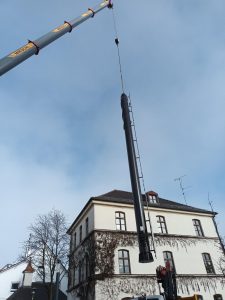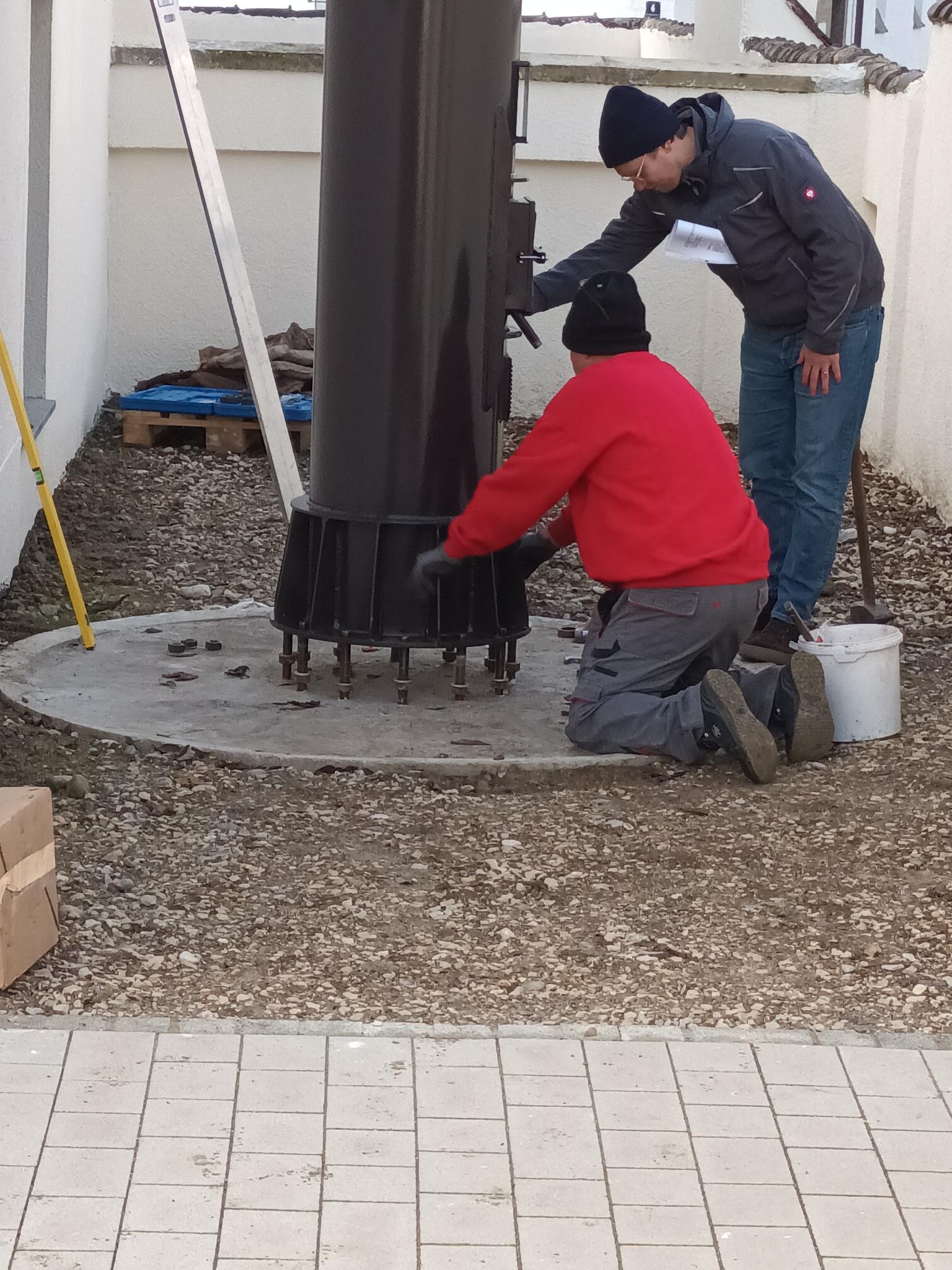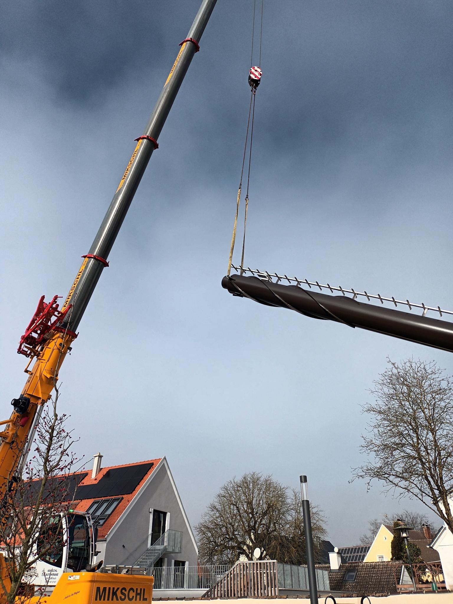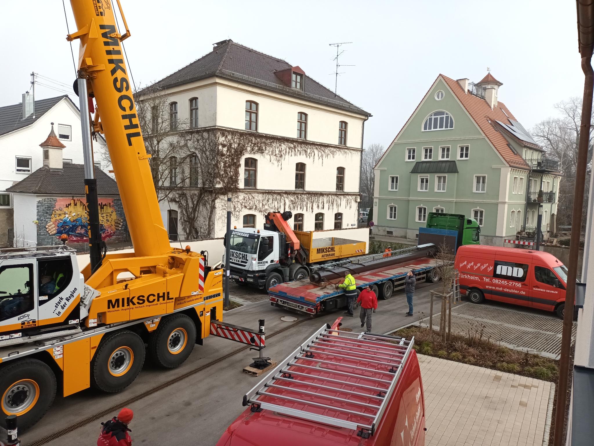 Am 5. Februar wurde am Pfarrhof die neue Schornsteinanlage für unser Nahwärmenetz geliefert und aufgestellt; der hohe Kamin wurde nötig, damit die Abgase der Heizanlage erst in grosser Höhe austreten. Dank der guten Zusammenarbeit der Firma KTO Engeneering GmbH und Co. KG, der Süd-West-Kamin Technik GmbH und der Autokrane Mikschl GmbH können wir jetzt Kirche, Pfarrzentrum und Pfarrhaus wieder beheizen!