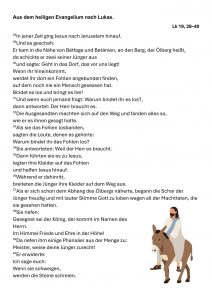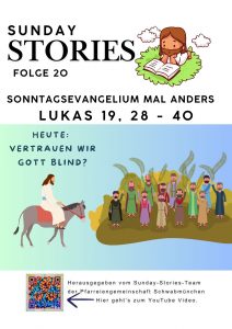 Sunday Stories – Folge 20: „Vertrauen wir Gott blind?“ – Lukasevangelium Posted on April 12, 2025 by Karola Nothofer No comments Categories: Aktuelles, PGTags: Bibel, esel, geschichte, Jesus, Palmsonntag, podcast, sunday, sunday stories, youtube Erleben Sie den Karfreitag mit allen Sinnen – in der Kirche Mariä Himmelfahrt in SchwabeggFamiliengottesdienst am Ostermontag „Zwei Jünger auf dem Weg nach Emmaus!“