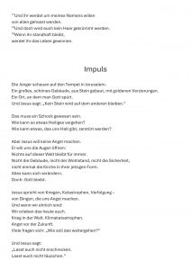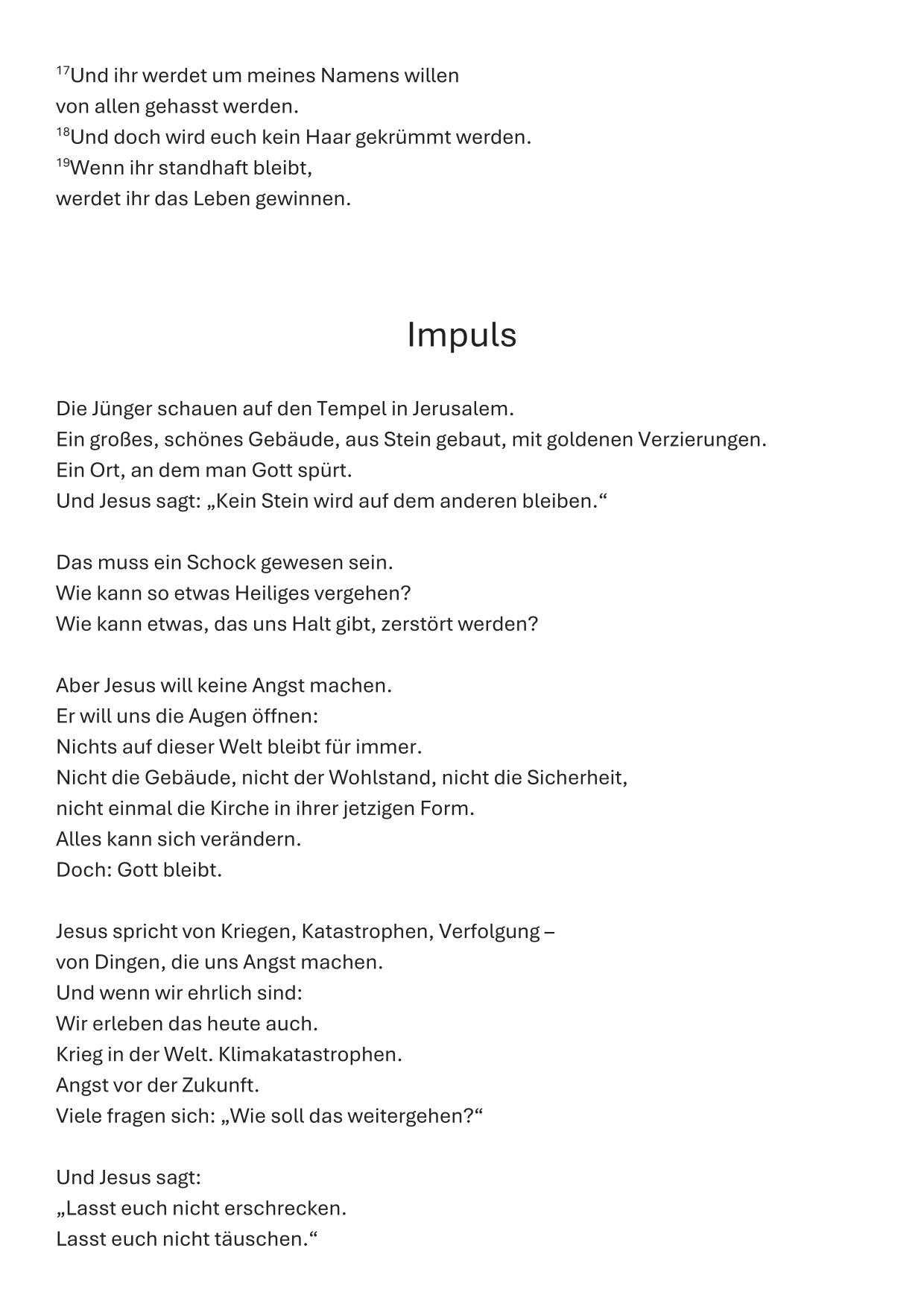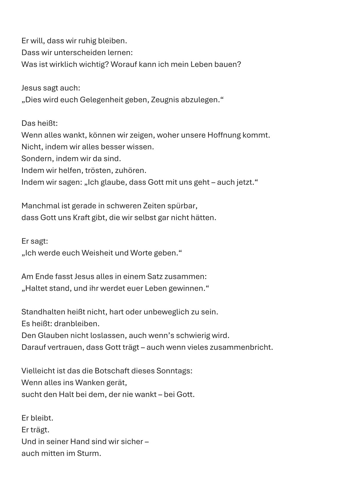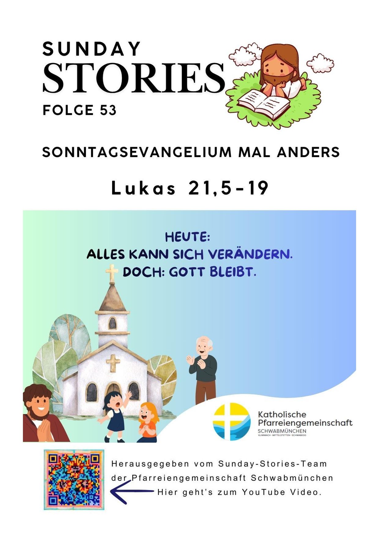 Sunday Stories – Folge 53 – „Alles kann sich verändern, doch: Gott bleibt!“ Posted on November 16, 2025 by Karola Nothofer No comments Categories: AktuellesTags: Besändigkeit, Evangelium, Halt, Jesus, podcast, Sonntag, sunday stories, veränderung, Wochenende „JESUS ERNEUERT SEINE KIRCHE“ – Einkehrtag mit Dekan Bernhard HesseAusstellung des Bistums Augsburg „Glaubenszeugen“ in der Stadtpfarrkirche