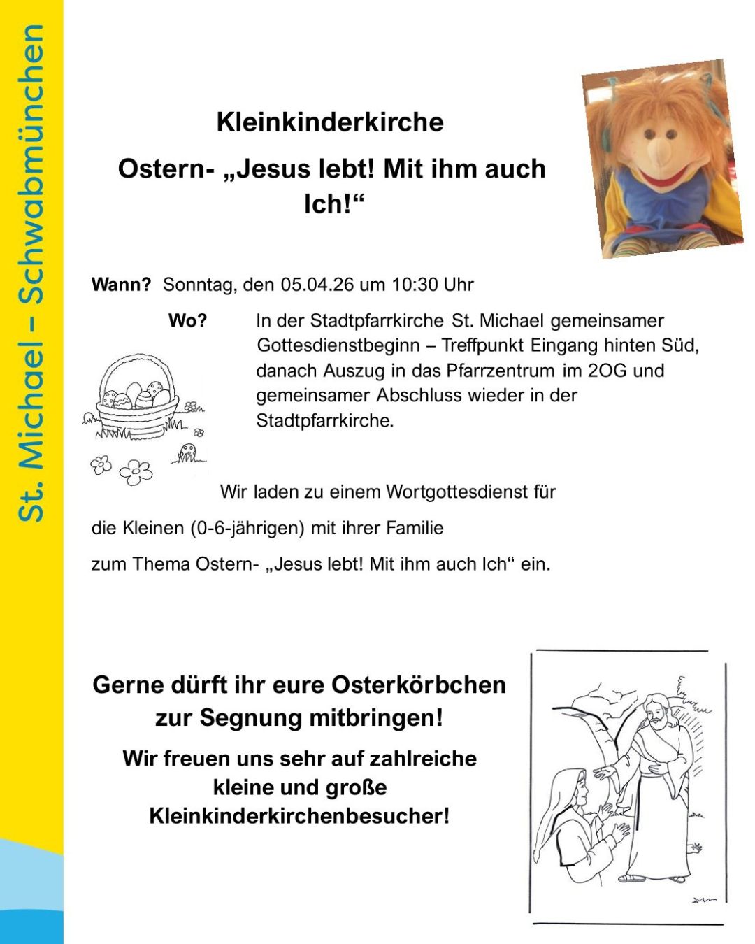 Ostersonntag – 05. April 2026 – „Jesus lebt – mit ihm auch ich!“ Herzliche Einladung zur Kleinkinderkirche Posted on März 25, 2026 by Pfarreiengemeinschaft Schwabmünchen No comments Categories: Aktuelles, PGTags: Jesus lebt, Kleinkinderkirche, ostereier, osterkörbchen, Ostern, wortgottesdienst Ostermontag – 06. April 2026 – Familiengottesdienst in St. Michael SchwabmünchenKarfreitag – 03. April 2026 – Kinderkreuzweg im Pfarrzentrum Schwabmünchen
