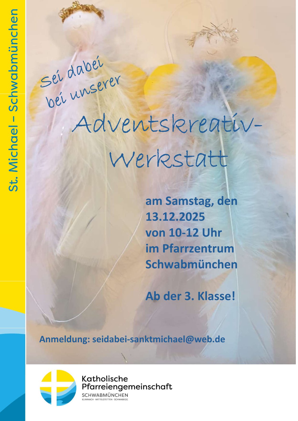 Adventswerkstatt für Kinder am Samstag, 13.12.2025 Posted on Dezember 8, 2025 by Karola Nothofer No comments Categories: Aktuelles, PGTags: advent, Basteln, DIY, Kinder, pfarrei, Pfarrzentrum, werkstatt Glaubensperlen entdecken – Kinderrosenkranz in der Unterkirche am Sonntag, 14.12.2025Kindermette mit Krippenspiel – Weihnachten, 24.12.16:00 Uhr