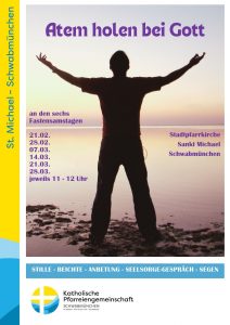 „Atem holen bei Gott“ an den sechs Fastensamstagen in der Kirche St. Michael Posted on Februar 11, 2026 by Pfarreiengemeinschaft Schwabmünchen No comments Categories: Aktuelles, PGTags: Anbetung, Atem holen, atmen, Beichte, Fastenzeit, Gespräch, Gott, Seelsorge, Segen, Stille Wir „BIBEL-LAUFEN“ wieder! Am 20. Februar um 6:00 Uhr morgens geht’s los!Gottesdienst zum Valentinstag am 15.02.2026