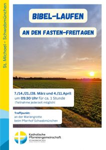Bibel-Laufen an den Fasten-Freitagen, ab dem 07. März Posted on März 8, 2025 by Karola Nothofer No comments Categories: Aktuelles, PGTags: Bewegung, bibel. laufen, Fastenzeit, Gehen, morgens, Natur, Spaziergang Abend der Barmherzigkeit mit Bischof Dr. Bertram Meier am Samstag, 15. MärzATEM HOLEN BEI GOTT – an den sechs Fastensamstagen ab dem 08. März