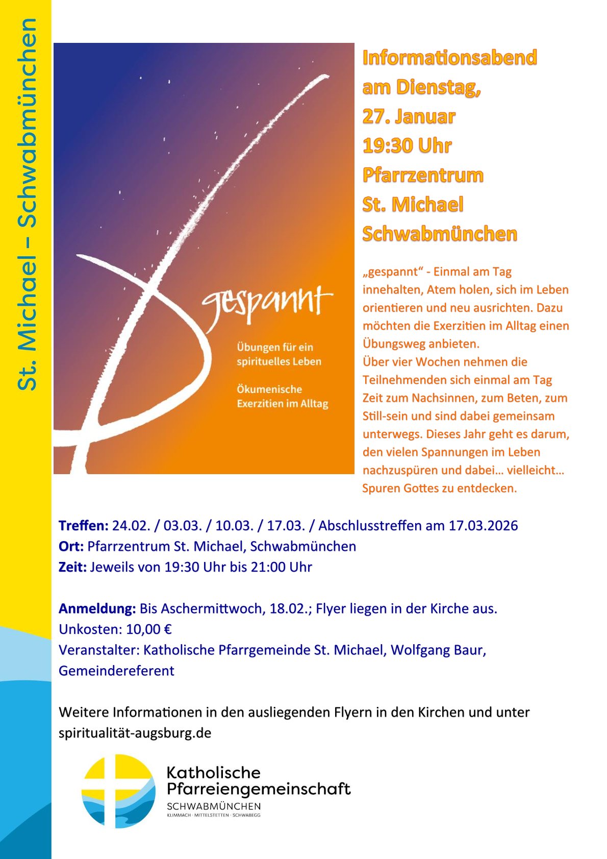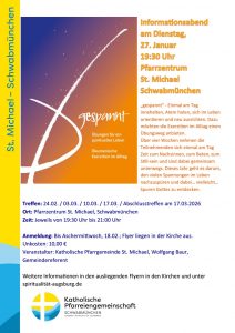 Exerzitien im Alltag „…einmal am Tag innehalten“ Infoabend am 27. Januar im Pfarrzentrum Posted on Januar 20, 2026 by Pfarreiengemeinschaft Schwabmünchen No comments Categories: Aktuelles, PGTags: alltag, Atem holen, entspannen, exerzitien, fürDich, gespannt, metime, Stille Bibelfrühstück für Kinder ab der 3. Klasse am Samstag, 24. Januar 2025 im Pfarrzentrum„Gib mit ein Wort“ – Sonntagsevangelium mal anders – Folge 63