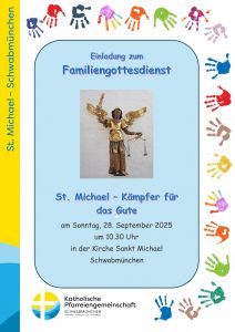 Familiengottesdienst „St. Michael – Kämpfer für das Gute!“ am Sonntag, 28.09.2025 um 10:30 Uhr Posted on September 25, 2025 by Karola Nothofer No comments Categories: AktuellesTags: einladung, famieliengottesdienst, Familie, Familienleben, glaube, katholisch, patrozinium, Schwabmünchen, Sonntag, St. Michael Feiern Sie mit – Patrozinium St. Michael mit Abend der Barmherzigkeit, Nachtanbetung, Familiengottesddienst und LobpreisabendSunday Story – Folge 46 „Zu Lebzeiten achtsam sein“
