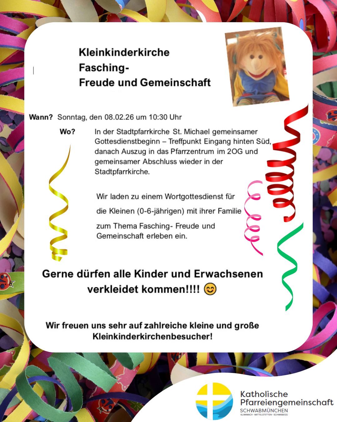 Fasching!!! Herzliche Einladung zur Kleinkinderkirche – kommt alle maskiert! Posted on Februar 4, 2026 by Pfarreiengemeinschaft Schwabmünchen No comments Categories: Aktuelles, PGTags: erziehung, Familie, fasching, glaube, Gottesdienst, Kinder, Kirche, Kleinkind, nachwuchs „Gib mir ein Wort“ – Sonntagsevangelium mal anders – Folge 64Endlich wieder – unser beliebte Lobpreisabend – 05. Februar nach der Abendmesse
