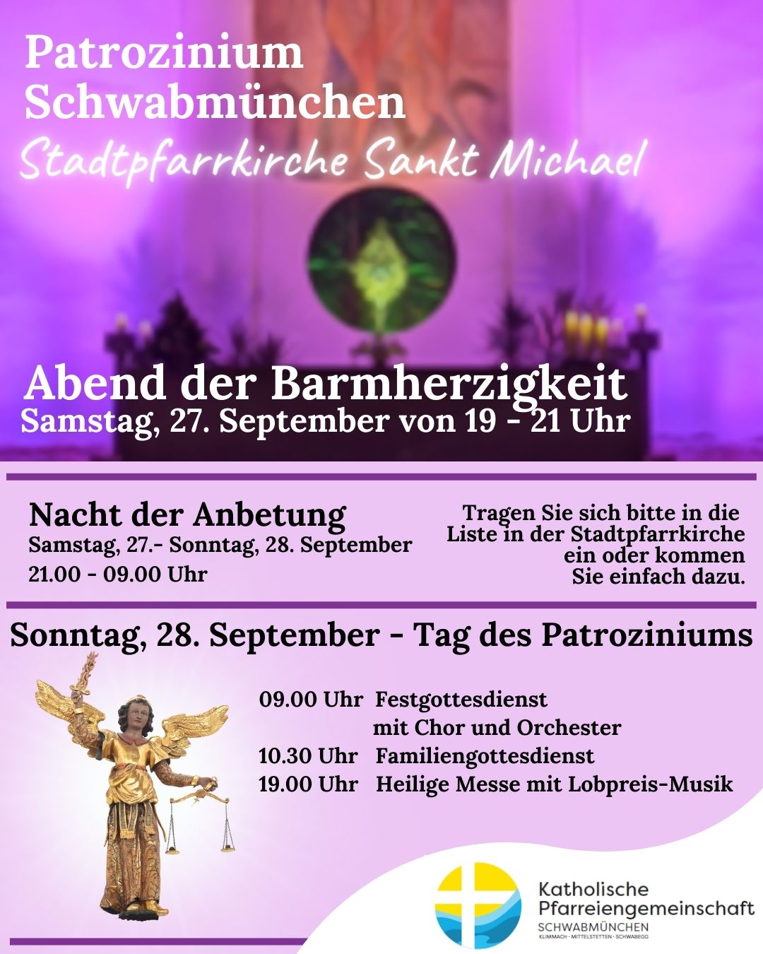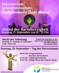 Feiern Sie mit – Patrozinium St. Michael mit Abend der Barmherzigkeit, Nachtanbetung, Familiengottesddienst und Lobpreisabend Posted on September 23, 2025 by Karola Nothofer No comments Categories: AktuellesTags: abend, Anbetung, Engel, Feier, Fest, heiliger, heiligermichael, Lobpreis, nacht, nachtanbetung, patrozinium, St. Michael Sunday Stories – Folge 45 „Macht Euch Freunde mit dem ungerechten Mammon“Familiengottesdienst „St. Michael – Kämpfer für das Gute!“ am Sonntag, 28.09.2025 um 10:30 Uhr