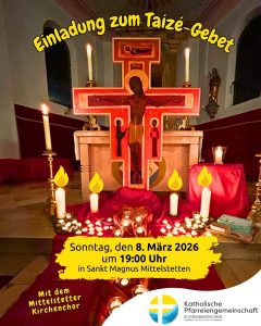 Herzliche Einladung zu unserem Taizé-Gebet – einer besonderen, meditativen Form eines Gottesdienstes. Fühlen Sie sich eingeladen, eine Zeit aus dem Alltag auszusteigen und Gott in ihrem Heren Raum zu geben. Gewinne inneren Frieden und Vertrauen – eine Zeit nur für DICH!