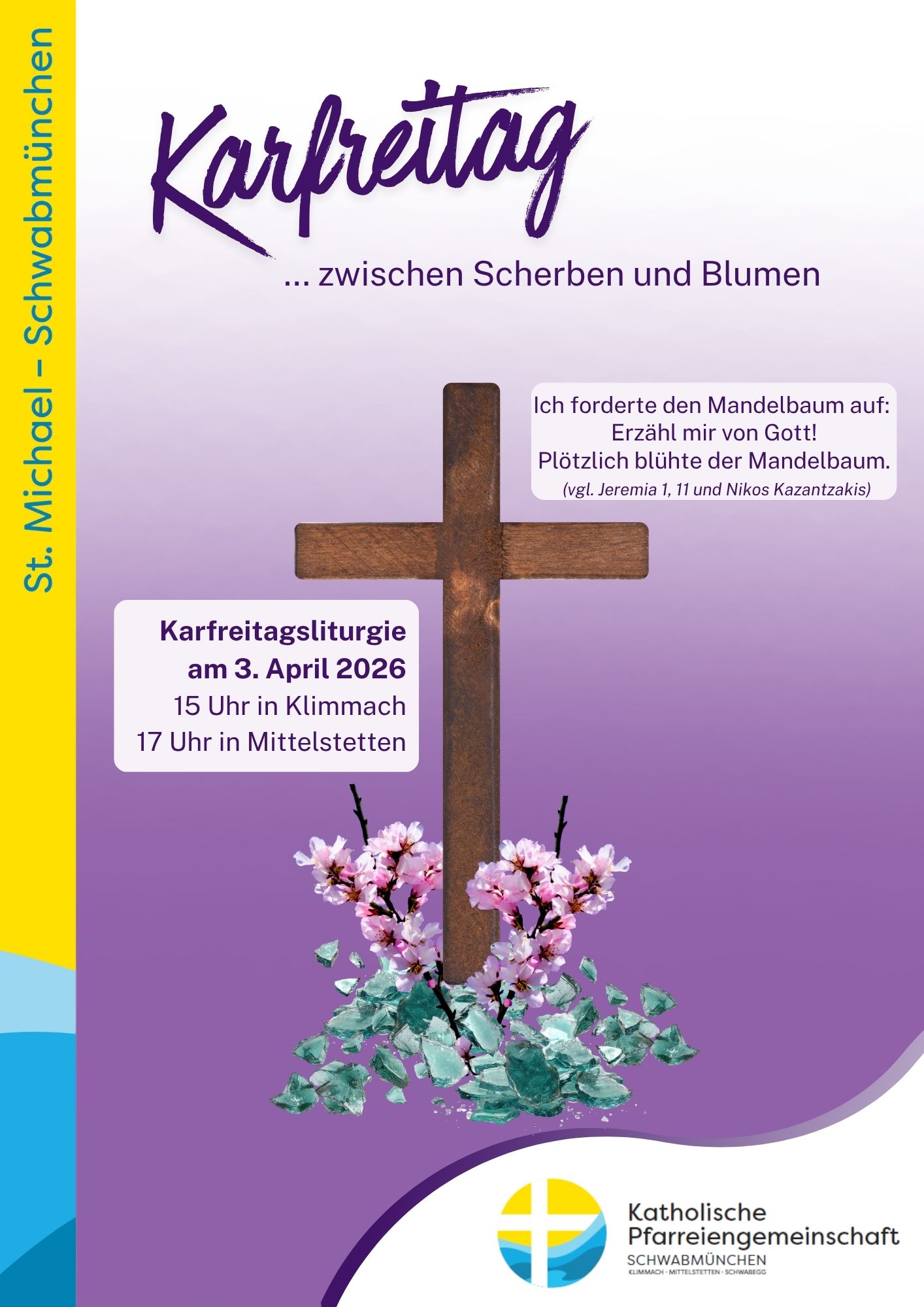 Karfreitag – 03. April 2026 – Zwischen Scherben und Blumen Posted on März 26, 2026 by Pfarreiengemeinschaft Schwabmünchen No comments Categories: Aktuelles, PGTags: auferstehung, Blumen, Blüte, Karfreitag, Klimmach, Mandelbaum, Mittelstetten, Ostern, scherben Karfreitag – 03. April 2026 – Kinderkreuzweg im Pfarrzentrum SchwabmünchenPalmsonntag – 29.03.2026 Kinderrosenkranz in der Unterkirche – dieses mal mit Osterspecial