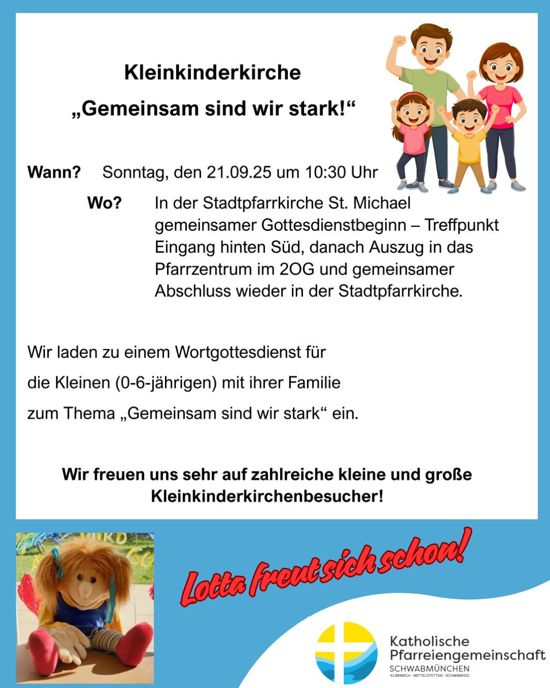 Kleinkinderkirche „Gemeinsam sind wir stark!“ am Sonntag, 21.09. um 10:30 Uhr in St. Michael Posted on September 18, 2025 by Karola Nothofer No comments Categories: AktuellesTags: erziehung, Familie, Familienleben, gemeinsam, glaube, Kinder, stark Sunday Stories – Folge 44 „Warum das Kreuz ein Symbol der Rettung ist“Sunday Stories – Folge 45 „Macht Euch Freunde mit dem ungerechten Mammon“