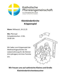 Krippenspiel der Kleinkinderkirche im Pfarrzentrum an Heilig Abend Posted on Dezember 13, 2025 by Karola Nothofer No comments Categories: Aktuelles, PGTags: christkind, erziehung im Glaube, heilig Abend, Kleinkinderkirche, krippenspiel, Pfarrzentrum „A kloins Lichtle“ – ein Adventskalender der PG Schwabmünchen