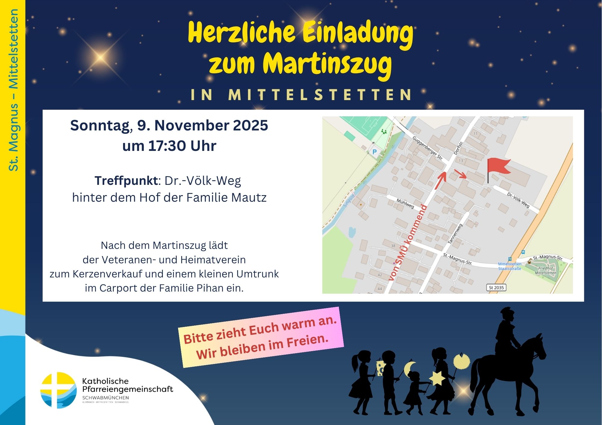 Martinsumzug in Mittelstetten am 09. November 2025 um 17:30 Uhr Posted on November 5, 2025 by Karola Nothofer No comments Categories: AktuellesTags: Familie, Laterne, Martinsumzug, Mittelstetten, st. martin Auf den Spuren von Taizé – Pilgerreise nach Burgund in Frankreich mit der Pfarreiengemeinschaft Schwabmünchen und STUHLER REISENSunday Stories – Folge 52 – „Hat Gott noch einen Platz in unserem Leben?“