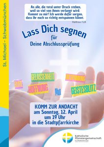 Sonntag, 12. April 2026 – Lass Dich für Deine Abschlussprüfung segnen! Posted on März 20, 2026 by Pfarreiengemeinschaft Schwabmünchen No comments Categories: Aktuelles, PGTags: abitur, abschlussprüfung, mittlere reife, prüfung, qualifizierter Hauptschulabschluss, realschulabschluss, schule Sonntag – 22.03.26 – Jugendandacht auf dem Dachboden unserer Kirche St. MichaelGib mit ein Wort – Folge 71 – Sonntagsevangelium mal anders