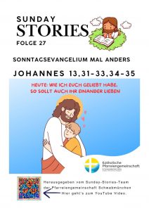 Sunday Stories – Folge 27 „Wie ich Euch geliebt habe, so sollt auch Ihr Euch einander lieben!“ Posted on Mai 18, 2025 by Karola Nothofer No comments Categories: Aktuelles, PGTags: Gott, Hirte, Jesus, liebe, Mensch, sunday stories Sunday Stories Folge 26 „Der Hirte und seine Schafe, eine vertrauensvolle Beziehung“Maiandachten in unserer Pfarreiengemeinschaft Schwabmünchen