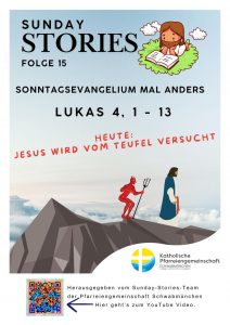 „Sunday Stories“ Folge 15: Jesus wird vom Teufel versucht – Lukasevangelium Posted on März 9, 2025 by Karola Nothofer No comments Mit dem QR Code können Sie unsere wöchentlichen SundayStories auch auf unserem YouTubeKanal „PG Schwabmünchen“ anhören! Außerdem auf Instagram unter Highlights! Categories: Aktuelles, PGTags: Jesus, lukasevangelium, podcast, Sonntag, sunday stories, youtube ATEM HOLEN BEI GOTT – an den sechs Fastensamstagen ab dem 08. März„Sunday Stories“ Folge 16: Während Jesus betet, verändert sich sein Aussehen – Lukasevangelium