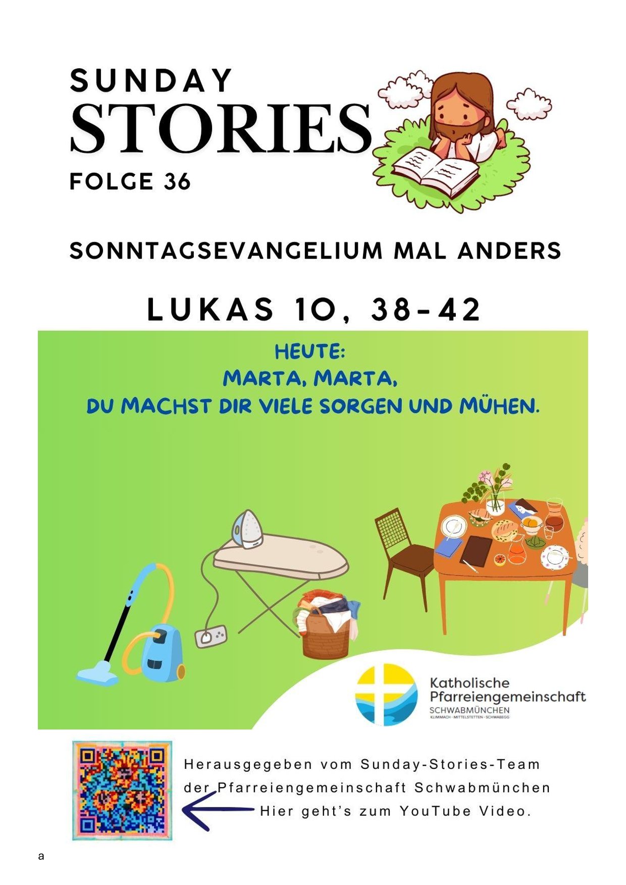 Sunday Stories – Folge 36: „Marta, Marta, du machst dir viele Sorgen und Mühen“! Posted on Juli 20, 2025 by Karola Nothofer No comments Auch direkt zum Anhören auf YouTube (PG Schwabmünchen), auf Instagramm und Facebook – oder über diesen QR-Code! Categories: Aktuelles, PGTags: abschalten, helfen, lukas, lukasevangelium, Maria, mühe, nächstenliebe, podcast, Sonntag, sorge, sunday, sunday stories, Wochenende, zuvielArbeit Kindermusical „Der ganz Kühlschrank s(w)ingt – Kartenvorverkauf am Stadtfest!Sunday Stories – Folge 37: „Wir dürfen zudringlich sein!“