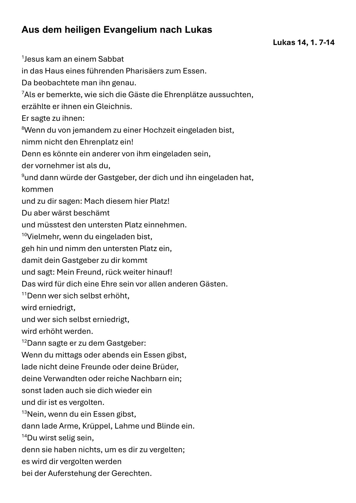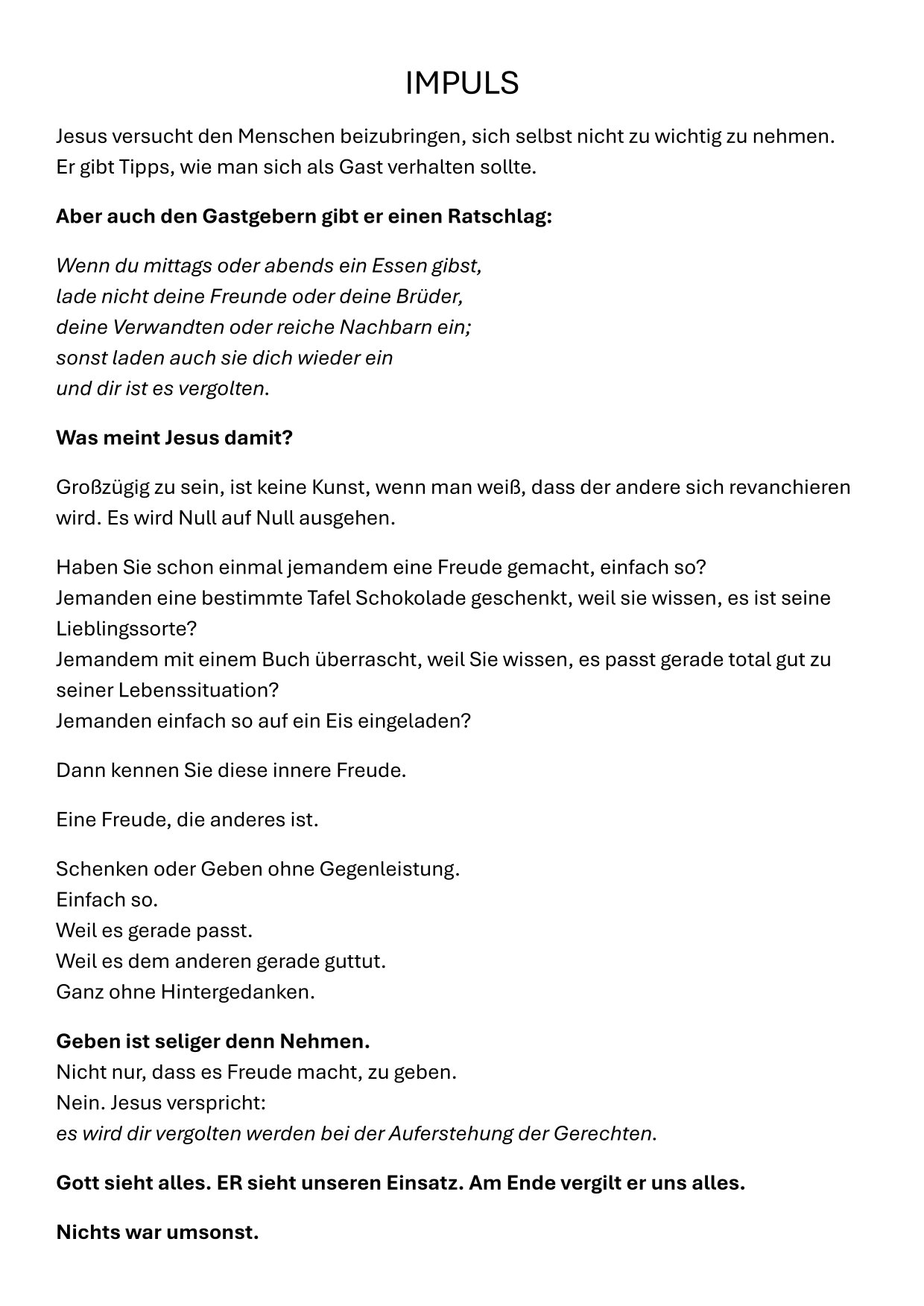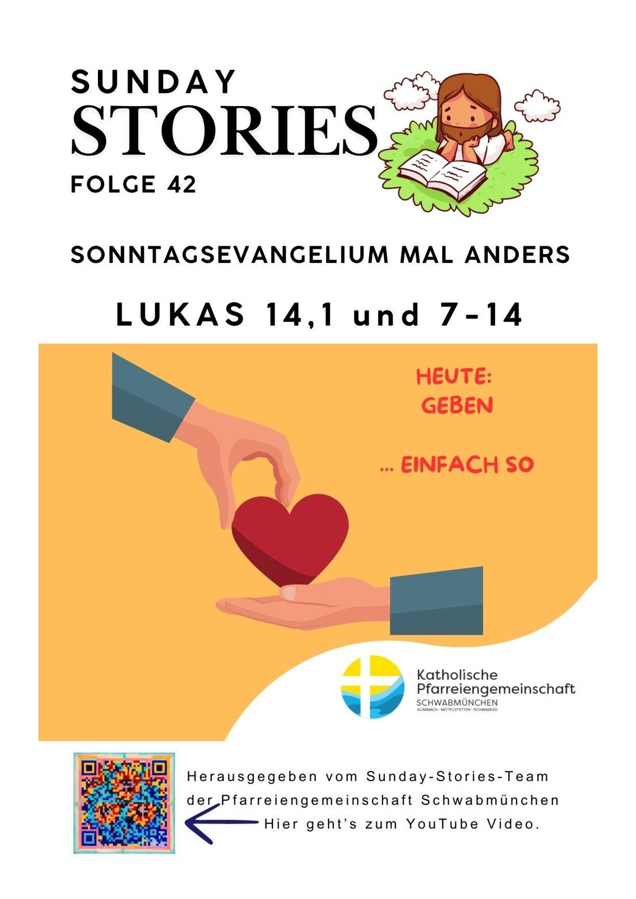 Sunday Stories – Folge 42 „Geben – einfach so!“ Posted on August 31, 2025 by Karola Nothofer No comments Categories: AktuellesTags: essen, gast, geben, gleichnis, Jesus, lukas, pharisäer, podcast. evangelium, Sonntag, story, sunday, sunday stories, Wochenende, youtube Sunday Stories – Folge 41 „-Bemüht Euch mit allen Kräften“Sunday Stories – Folge 43 – „Vorausschauend sein“