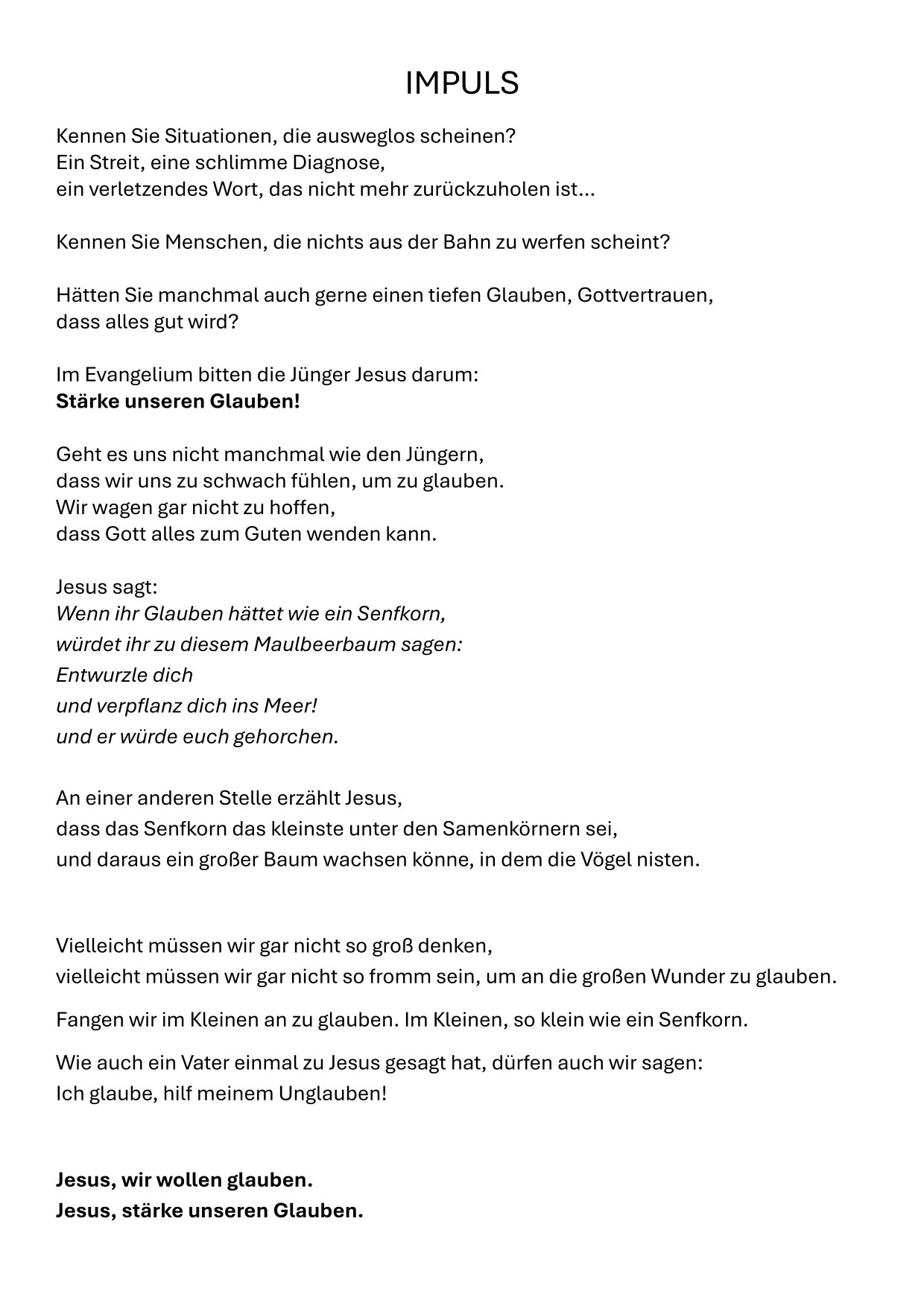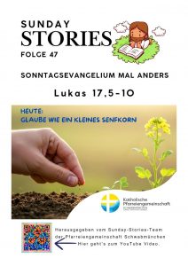 Sunday Stories – Folge 47 „Glaube wie ein kleines Senfkorn“ Posted on Oktober 5, 2025 by Karola Nothofer No comments Categories: AktuellesTags: glaube, Jesus, poscast, senfkorn, stärkeunserenglauben, stories, sunday stories Sunday Story – Folge 46 „Zu Lebzeiten achtsam sein“Ensembles in Schwabmünchen