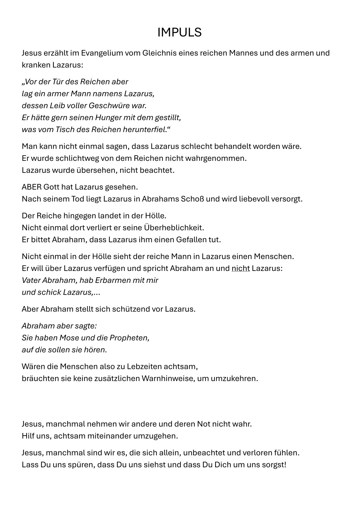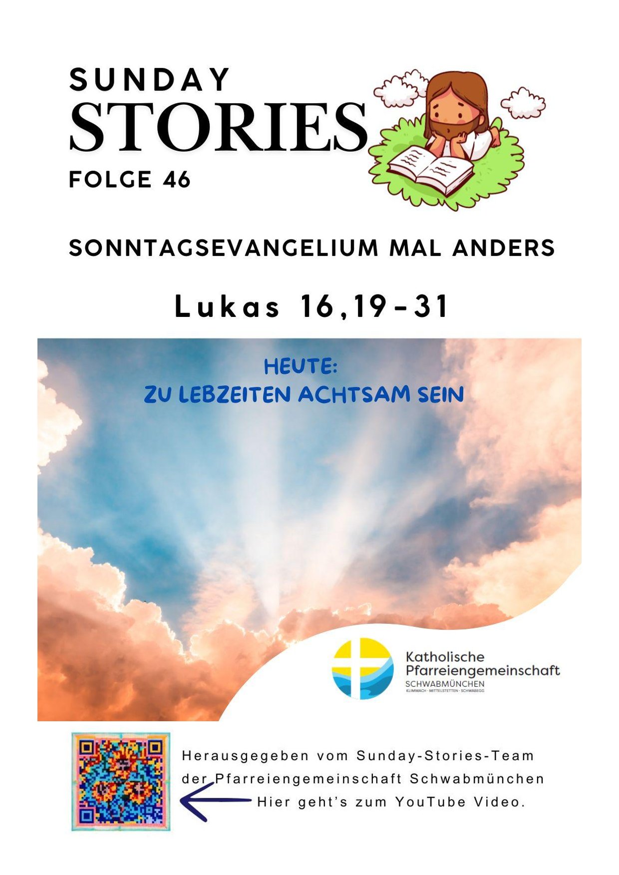 Sunday Story – Folge 46 „Zu Lebzeiten achtsam sein“ Posted on September 28, 2025 by Karola Nothofer No comments Categories: AktuellesTags: abraham, achtsam, arm, Evangelium, hunger, Leben, lukas, podcast, qual, reich, Sonntag, sonntagsevangelium, story, sunday, sundaystories, wasster Familiengottesdienst „St. Michael – Kämpfer für das Gute!“ am Sonntag, 28.09.2025 um 10:30 UhrSunday Stories – Folge 47 „Glaube wie ein kleines Senfkorn“